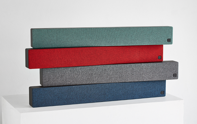 Il cabinet delle soundbar Neets SB1 sono realizzati in legno MDF ed è possibile optare per rivestimenti colorati esclusivi, in rosso, grigio, verde e blu,
